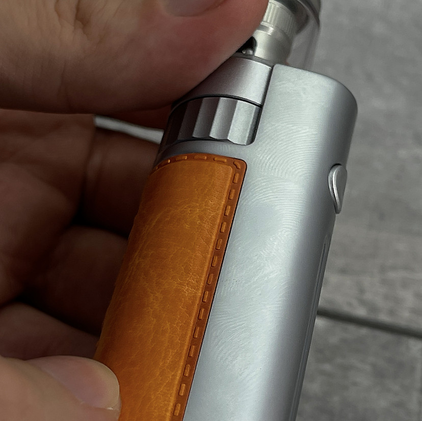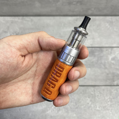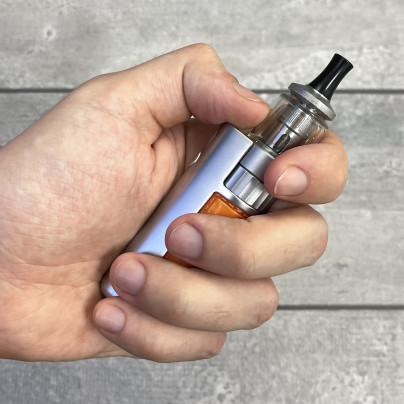 Вес батарейного блока получился 83.9 грамм, в то же время атомайзер достаточно легкий – всего 18.4. В ладони лежит уверенно (несмотря на размер), каким хватом его ни возьми, а кожа обеспечивает хорошую эргономику.