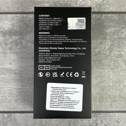 Так выглядит коробка, в которой спрятано устройство: на ее лицевой стороне находится название производителя и Подика, там же изображен VooPoo Drag Q, за которым напечатан причудливый узор. На задней части упаковки разместили информацию о комплекте, а по бокам характеристики Драг Кью.